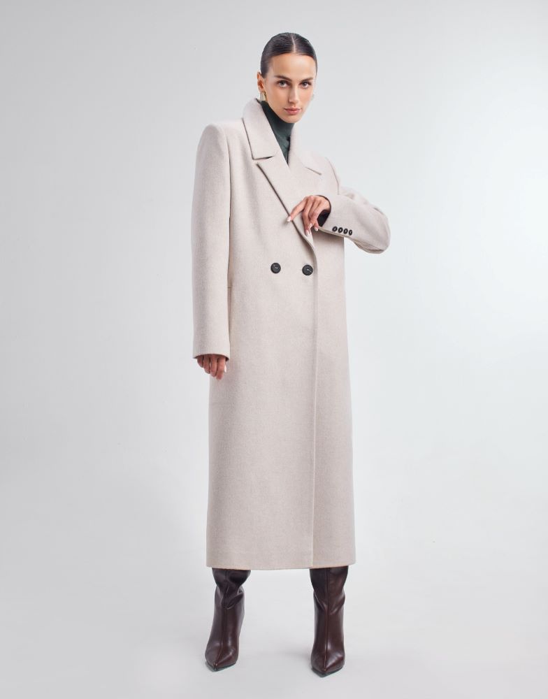 Пальто прямого силуэта. Двубортная. Состав 90% шерсть викуньи, 2%нейлон, 8% полиамид.Длина 120см