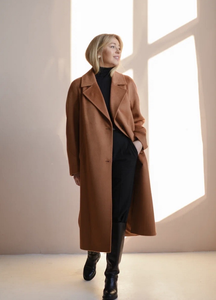 Прямой силуэт, цельнокроенный рукав с отделочной строчкой имитация ручного стежка, однобортное с декоративными роговыми пуговицами